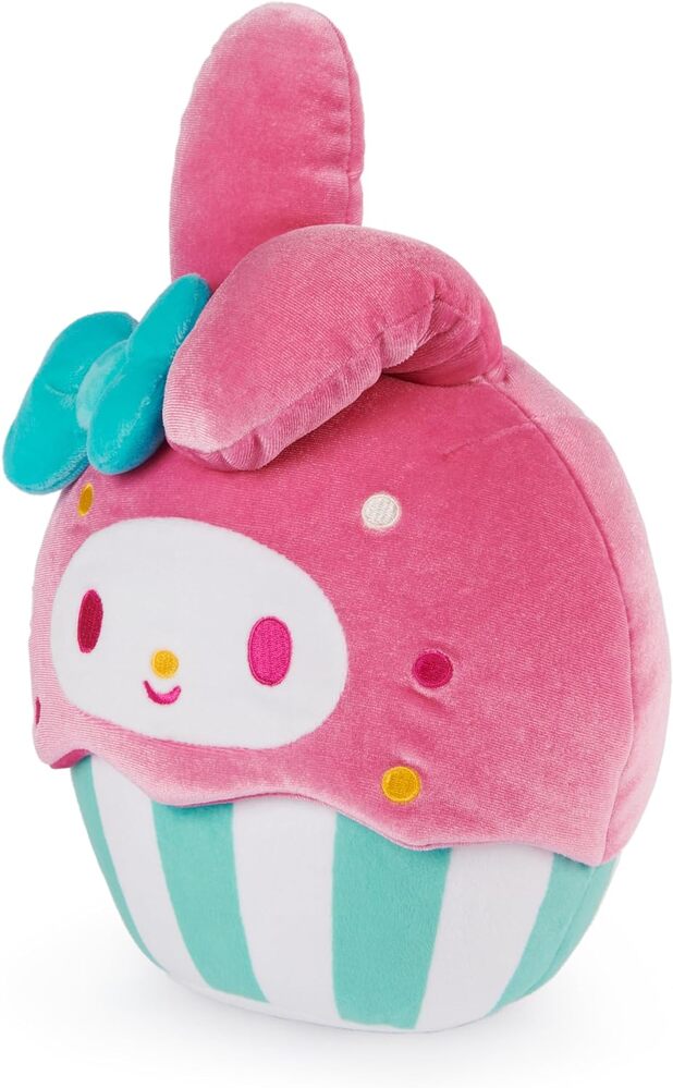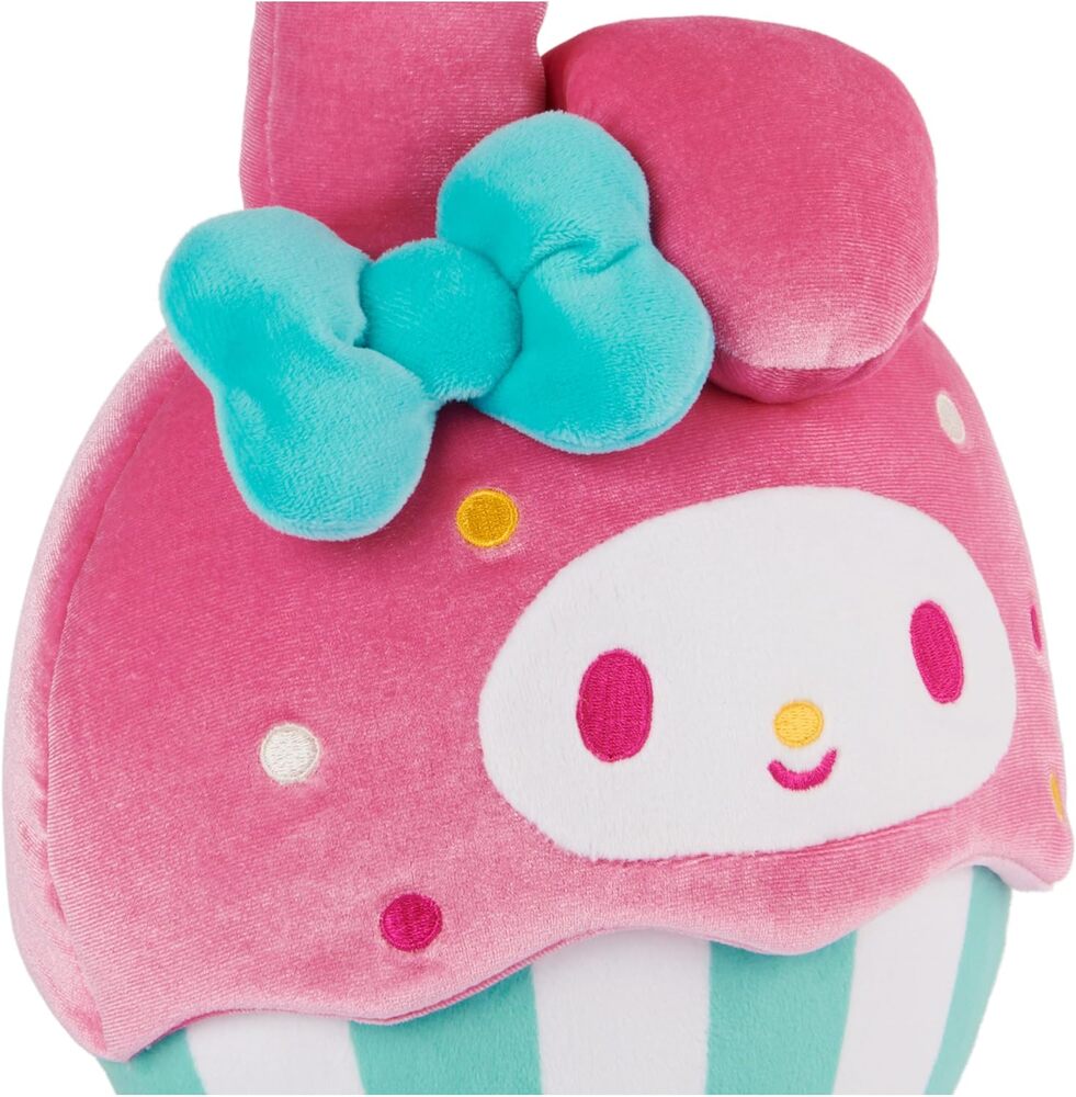 This huggable 8" cupcake plush features My Melody nestled in a green and white striped baking cup, wearing her iconic hot pink hood and an electric blue bow. My Melodys pink and yellow embroidered facial details also match the fun pink, white and yellow embroidered sprinkles that dot her hood. It's bright colourful design makes this soft plush an eye-catching piece for any kawaii plushie collector.