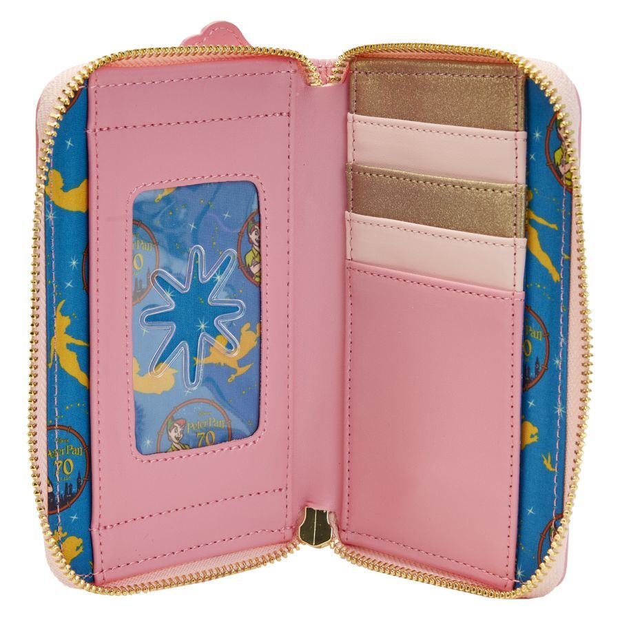 The Loungefly Peter Pan You Can Fly 70th Anniversary Zip Around Wallet is made of vegan leather (polyurethane) with glitter trim. Wallet zips closed with sturdy metal hardware. Additional features include applique, foil, embroidered, and printed details. Take note of the coordinating inside lining.