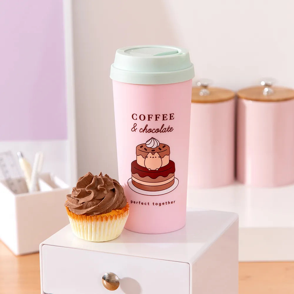 Celebrating coffee and chocolate being the perfect match, this vibrant Pusheen Travel Mug comes in a pastel pink colour with a mint green lid. The motifs showcase Pusheen as a decadent chocolate cake on the front, with the caption "Coffee & chocolate, perfect together". The reverse side showcases a cup of coffee alongside another delicious cake. Stay stylish and caffeinated on the go with this adorable travel mug.