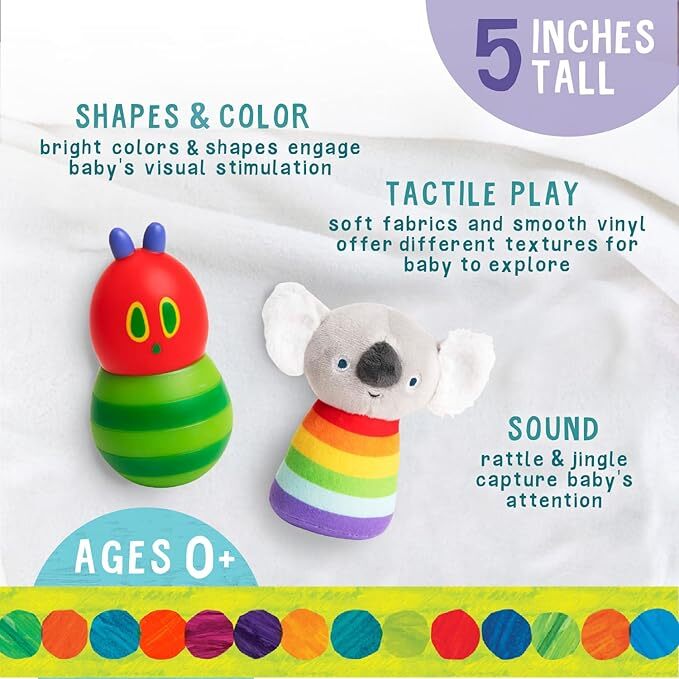 The Very Hungry Caterpillar Shake & Rattle set includes The Very Hungry Caterpillar rattle that jingles and a koala rattle. This set features bright colours and different shapes to help engage baby's visual stimulation. The rattle sounds capture baby's attention and the soft fabrics and smooth vinyl offer different textures for baby to explore. Suitable from birth. Surface wash.