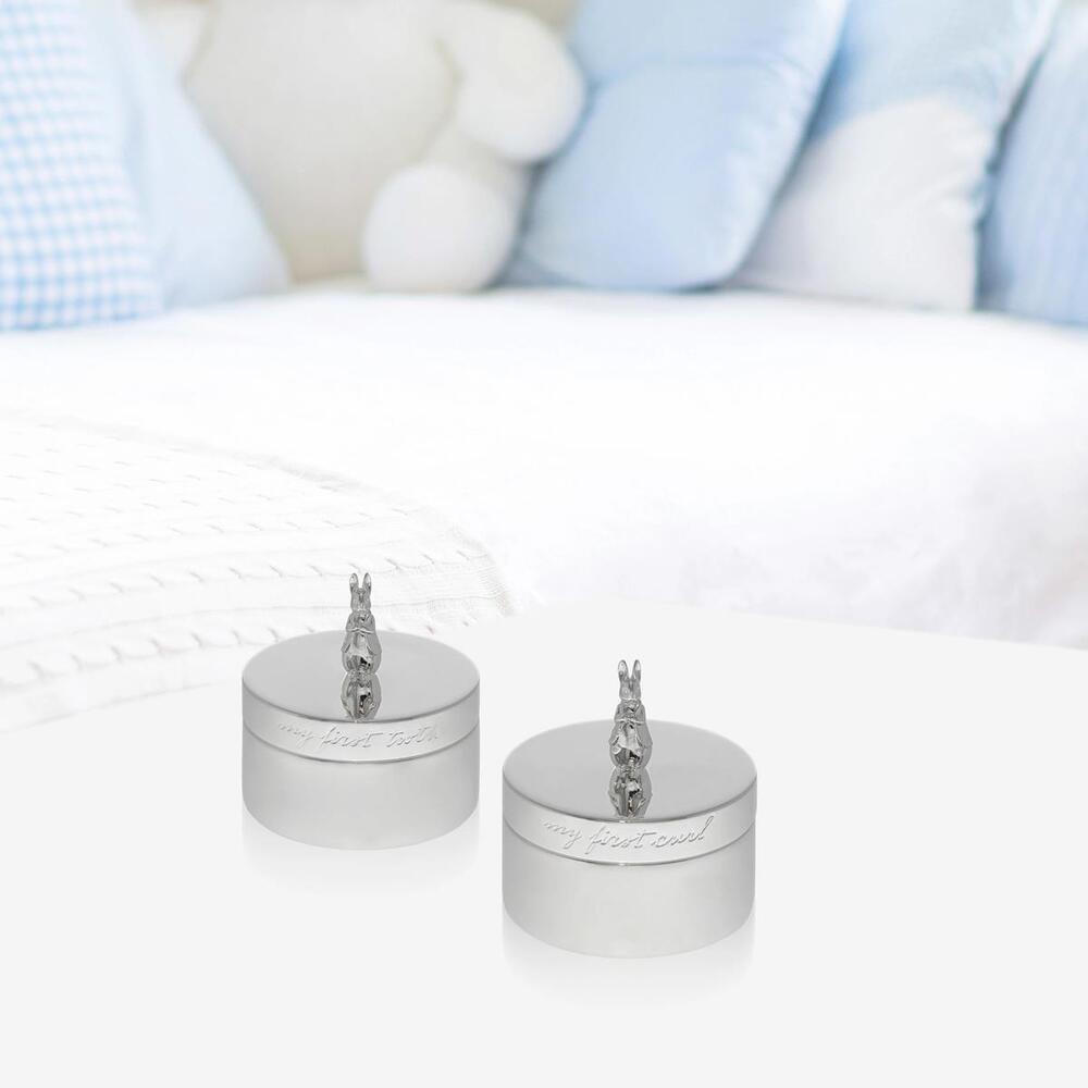 Celebrate a new bundle of joy with the Beatrix Potter New Baby collection. The silver-plated First Tooth and Curl boxes make a fantastic gift to store treasured keepsakes of a new arrival. With a sculpted Peter Rabbit on each lid and etched text around each box, they will become a treasured possession for new parents. Delivered in a branded Beatrix Potter gift box making it the perfect present for new parents or as a beautiful keepsake for a Christening.