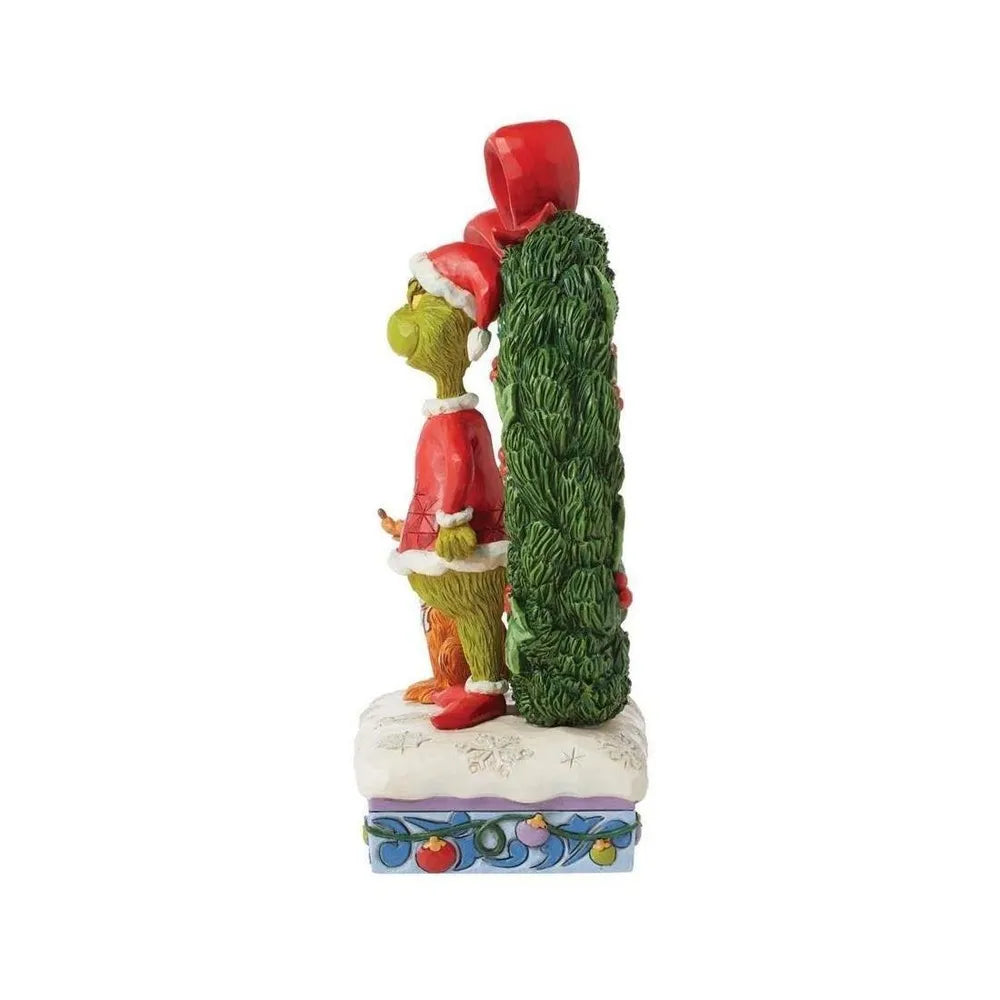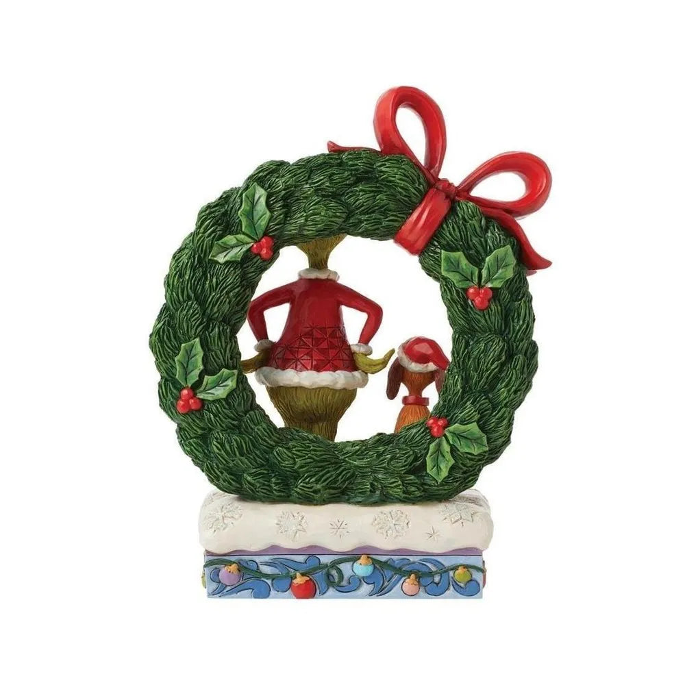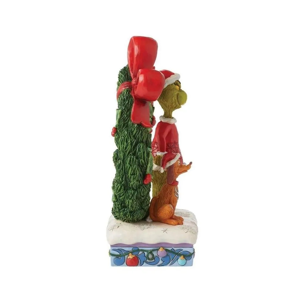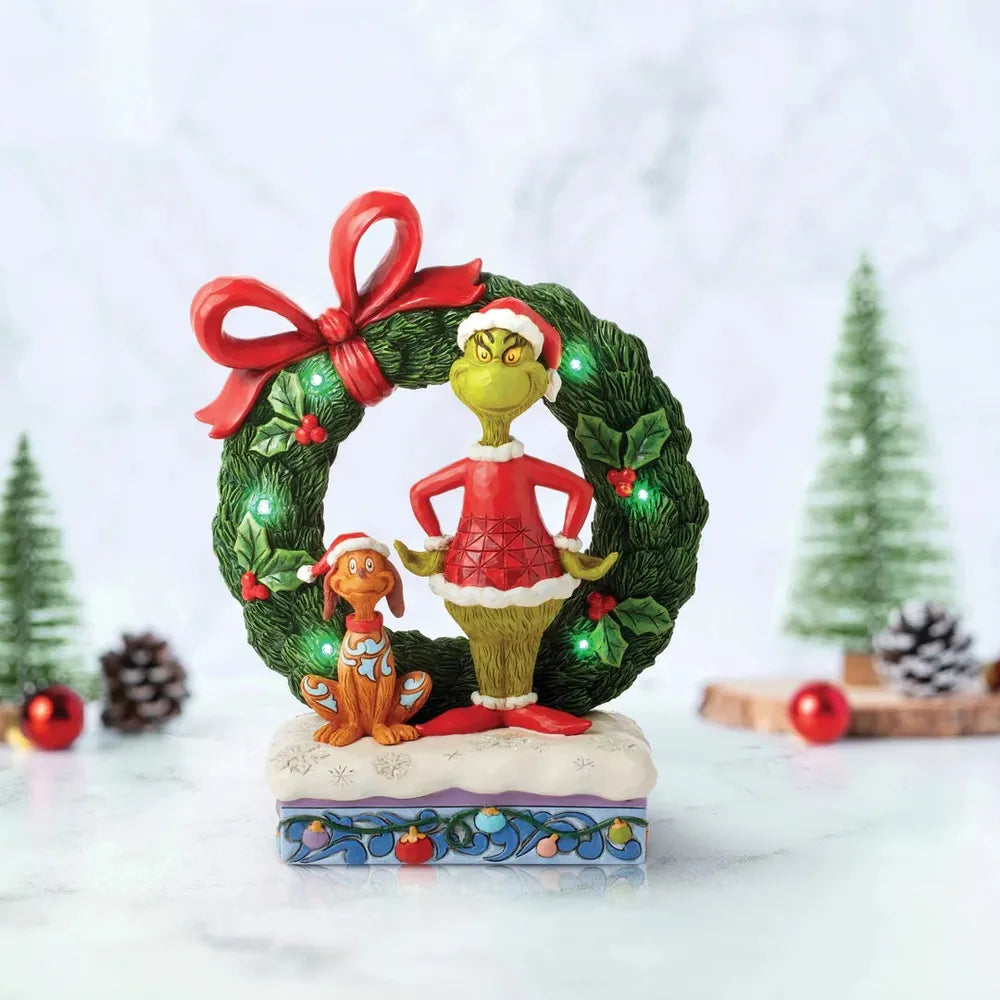 This Jim Shore creation features The Grinch and his loyal dog Max beside a large wreath. With a giant bow and mistletoe, the wreath lights up on a stage of snowflakes and ornaments. Dressed as Santa, the Grinch smiles sincerely with a larger heart.