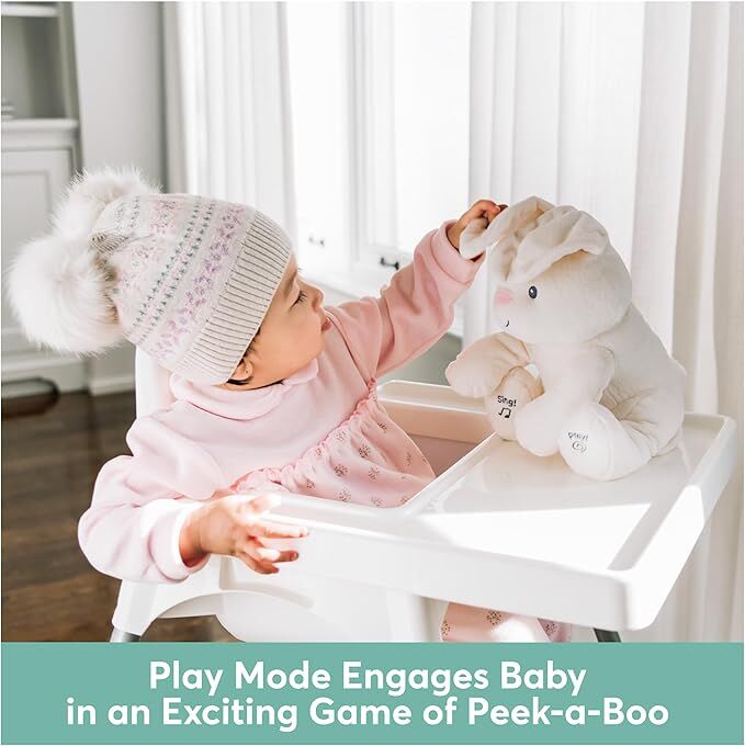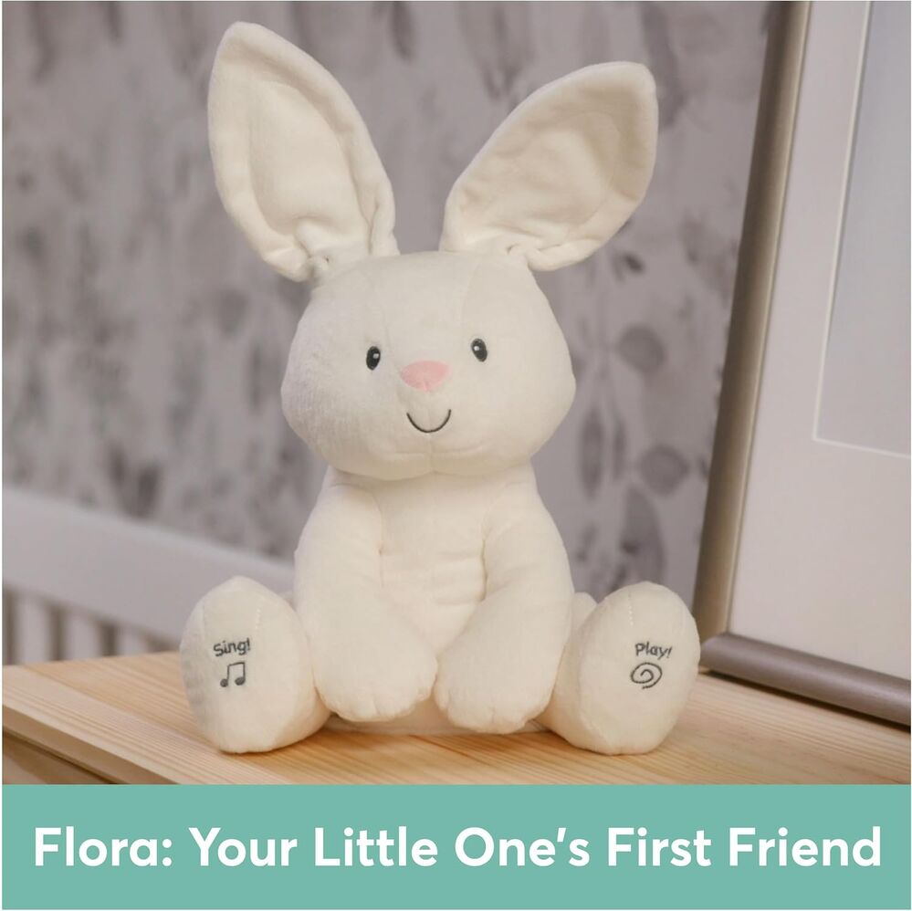 Flora the Bunny is an adorable singing animated plush with two different play modes. Press her left foot to play an interactive game of Peek-A-Boo, and her right foot to hear a "Peek-A-Boo" song in a cute child's voice. Suitable for ages 10m+. 3 x AA batteries included. Surface washable.