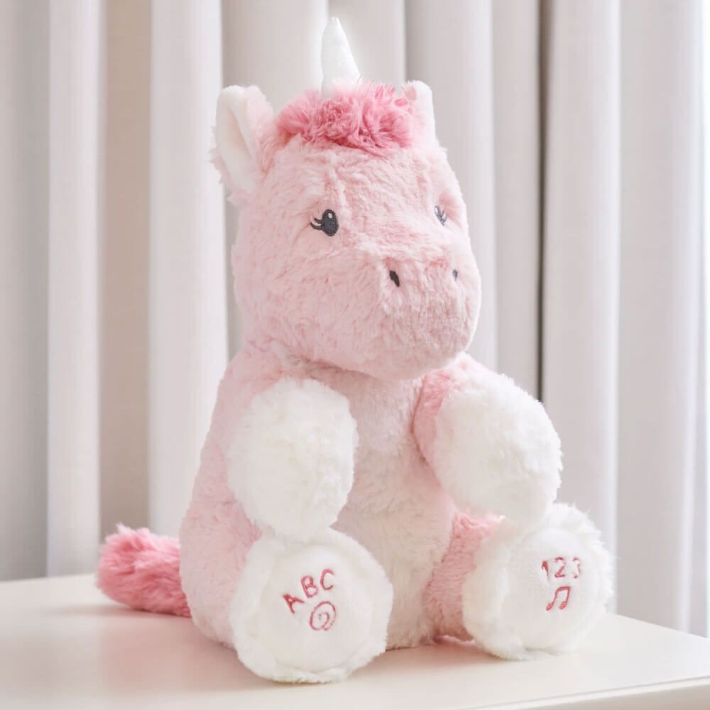 -This cuddly unicorn comes to life with singing and clapping functions that stimulate baby's senses and encourage tactile play