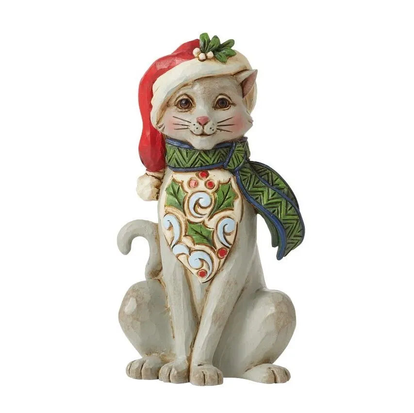 This smiling cat carries wears a Santa hat and festive scarf with holly and rosemaling fur. This Jim Shore miniature is a delight of color and detail. Celebrate the season with this charming piece of holiday home decor.