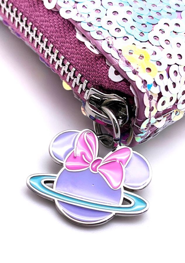 Get ready to glow alongside this holographic wallet! Under UV light, its iridescent sequins react! Featuring iconic Minnie Mouse ears and bow, front and side pockets, shiny silver hardware, 5 card slots, an ID slot and a Planet Minnie zipper charm, this purse is a one-of-a-kind addition to any Loungefly collector and Disney addicts closet!