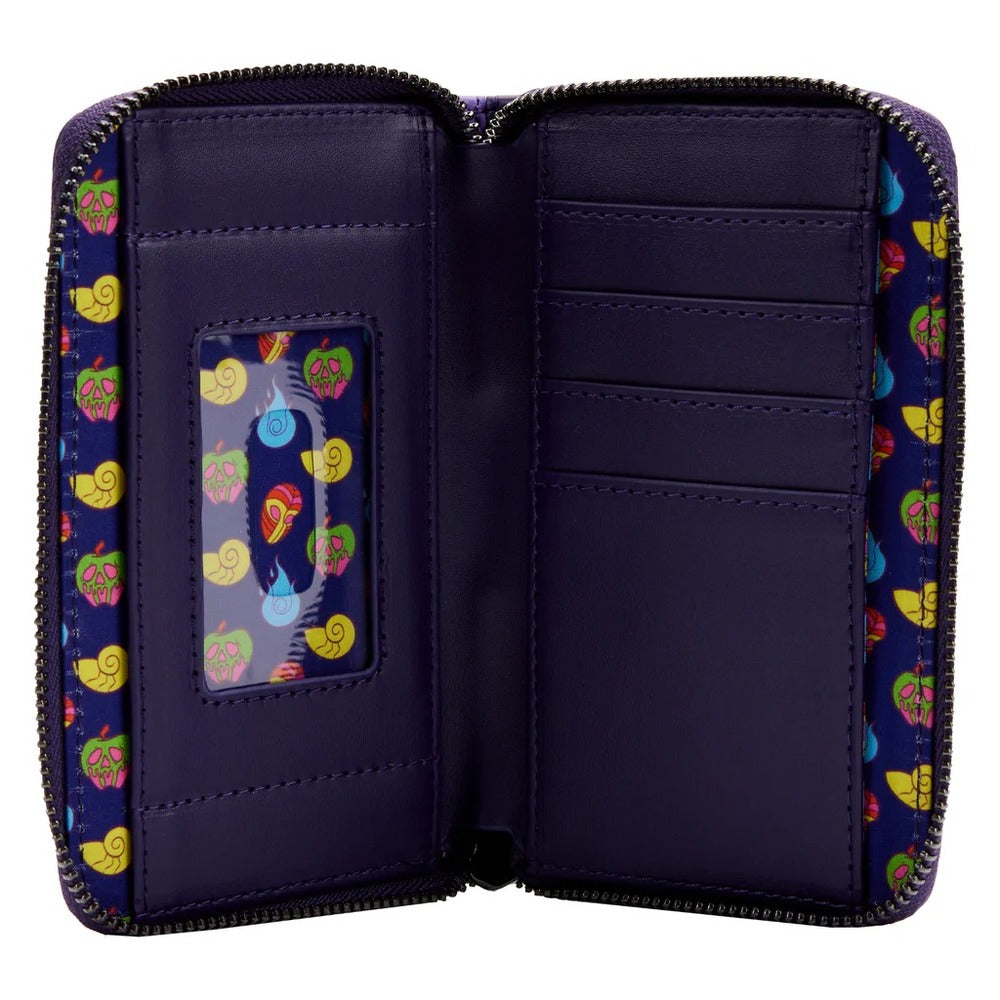 Your best fiends have gathered to safeguard your valuables on your journeys! Be wickedly fashionable as you carry this Loungefly Disney Villains in the Dark Zip Around Wallet. Ursula, Hades, Dr. Facilier, and the Evil Queen are eager for the opportunity to accompany you! Each Disney Villain exudes a colorful aura. Ursulas silhouette shows a golden hue, while Hades is cast in blue. Dr. Facilier is outlined in red, and the Evil Queens silhouette is green. On the back, youll find symbols associated with each villain, including the poison apple, a blue flame, a golden conch shell, and a colorful mask. On the inside, youll find 4 slots for carrying cards and 1 clear slot for holding your ID. This wallet is the perfect accessory for tucking away just what you need for a grand schemeor for transforming everyday travels into wonderfully wicked adventures.