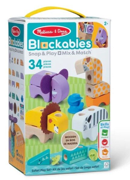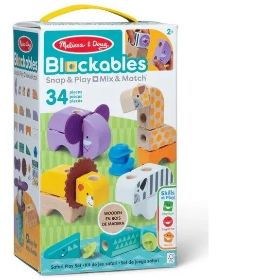 Melissa & Doug Blockables are connectable, stackable, and playable! The solid wood connect-and-play building blocks are perfect manipulatives to help preschoolers two and older boost developmental skills (fine motor, problem-solving, matching, storytelling, and self-esteem), while using their imaginations and having fun. Easy-to-grasp smooth, colourful wooden blocks fit together in a snap with large connectors that even little hands can push in and pull out. An illustrated guide shows how to arrange and link the Blockables to create multi-textured safari animals (zebra, alligator, lion with felt mane, elephant with felt ears, and giraffe), or kids can use their imaginations to mix, match, and combine pieces to make unique figures and play their own way! Kids can easily expand their collection - the 34-piece Safari Play Set is compatible with all other Blockables play sets. The packaging folds out to convert into a fun play space and pieces store in the sturdy corrugated box with a soft handle for easy cleanup and portability.