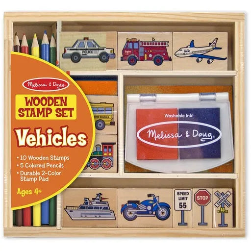 Go wherever your imagination takes you! It's easy to mix and match these detailed vehicle and traffic sign stamps to create hundreds of visual adventures. All the pieces, including the 2-color inkpad, store in a sturdy wooden box. Washable, kid-friendly ink.