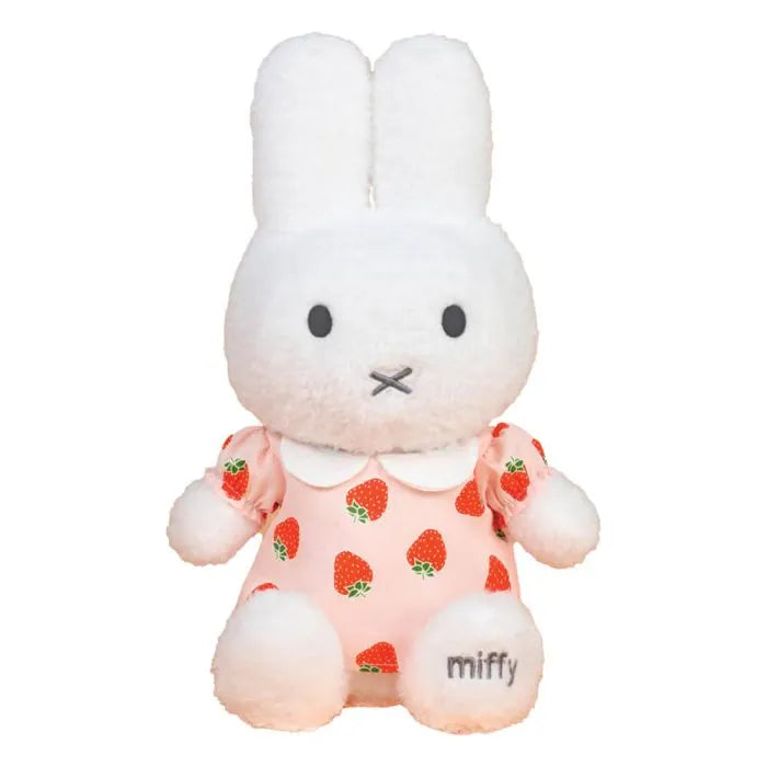 Sweeten your plush collection with the 25cm Miffy Plush Strawberry Dress Edition. Dressed in an adorable soft pink dress adorned with vibrant red strawberries, this version of Miffy is bursting with charm and character. Crafted from luxuriously soft plush material, Miffys white fur is as huggable as it is high-quality. Her embroidered name on the foot adds a classic, collectible touch, while the removable outfit allows for imaginative play or styling.Whether displayed on a shelf or cherished as a cuddle buddy, this plush is a delightful addition to any Miffy fan's worldperfect for gifting, collecting, or simply enjoying.