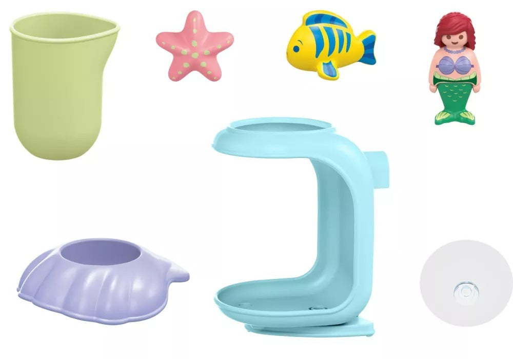 Set includes: Set includes: 1 Ariel figure, 1 Flounder figure, 1 shell shower with removable shell roof, 1 water cup and 1 starfish.
