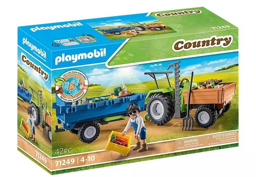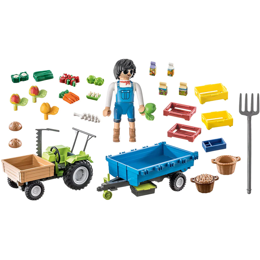 Set includes 1 man figure, 1 tractor with trailer, 4 tetra packs, 3 apples, 2 salads, 1 pepper, 1 cucumber, 5 transport boxes, 1 pitchfork, 2 cauliflower, 2 loaves of bread, 1 egg, 1 garlic, 1 carrot, 1 pasture basket and 1 potato basket.