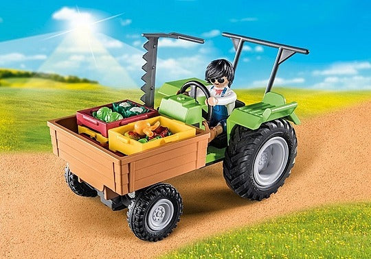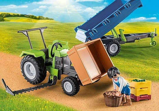 The tractor with a trailer transports the freshly harvested vegetables to the 24-hour shop, with a large loading area that can be tilted forward for unloading - help the farmer work in the fields with the cool Harvester Tractor with Trailer from Playmobil! With it's realistic features such as the tiltable loading area and the large tires, the green tractor offers a creative play experience. Fruits and vegetables are harvested fresh from the field, placed in the transport boxes and brought to the Country Farm Shop for sale.