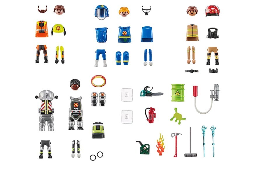 Set includes 4 men figures, 4 helmets, 1 fire extinguisher, 1 canister, 1 flame, 1 barrel, 1 axe, 1 broom, 1 saw