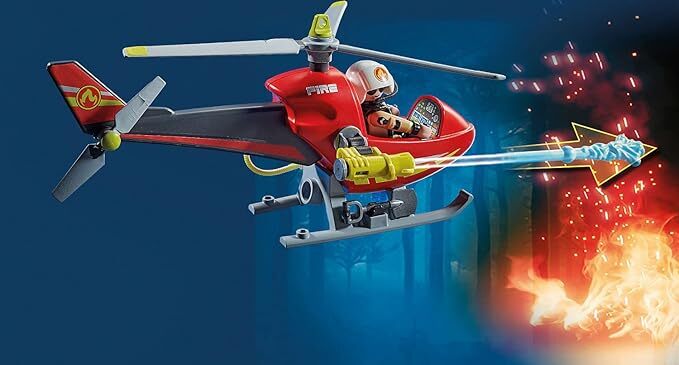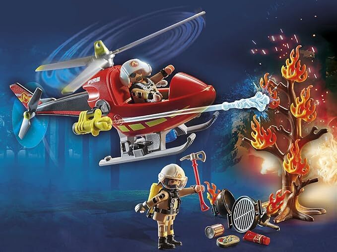 Set includes 1 pilot figure, 1 firefighter figure, 1 firefighting helicopter with water bullet, 1 pilot helmet, 1 firefighter helmet w. visor, 1 tree with attachable flames, 1 grill, 1 tuna can, 1 bottle of ketchup