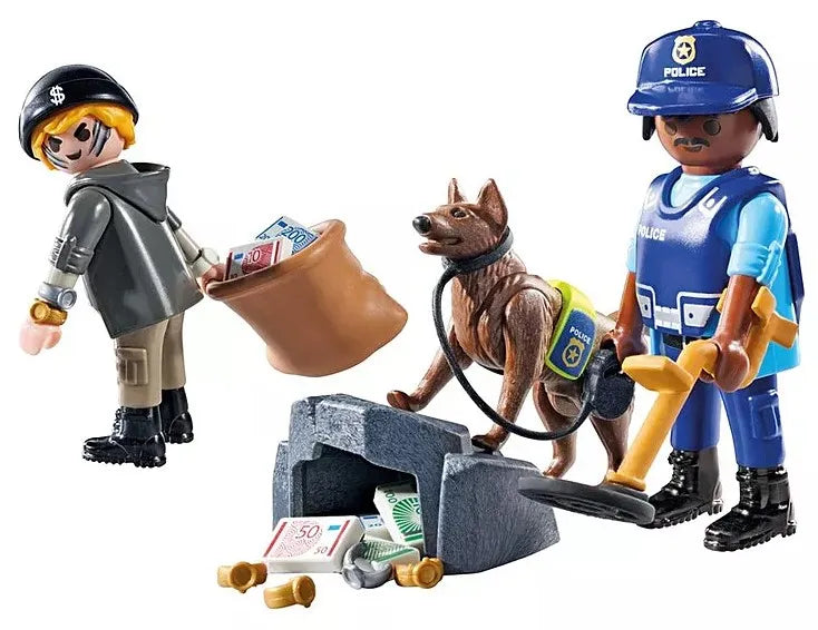 Embark on exciting adventures with this PLAYMOBIL Police set! The cunning crook hides his loot under a rocky hill, but the sharp-nosed police dog and the metal detector are on his trail. With realistic details like a police blanket for the dog, a leash, and a metal detector, each mission is packed with excitement and variety.