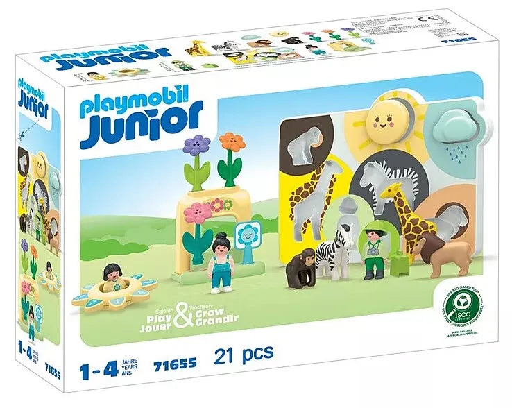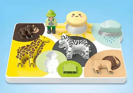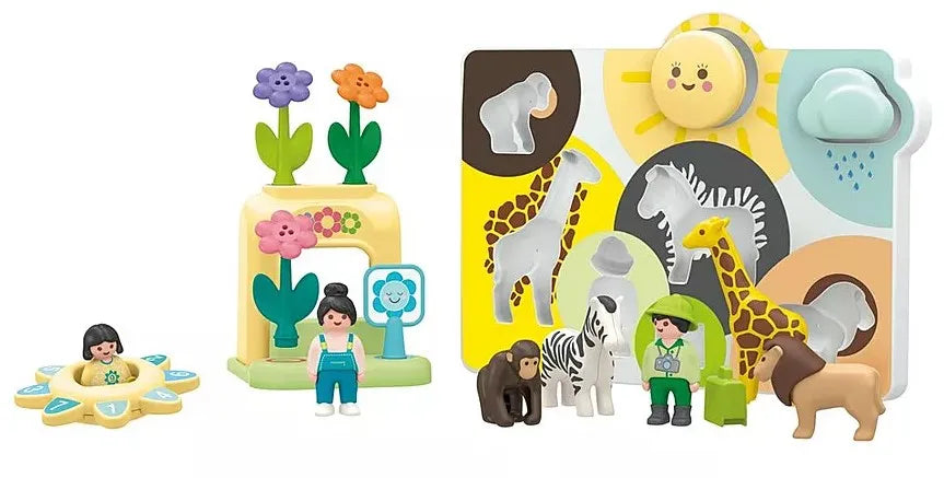 Looking for a PLAYMOBIL set designed for the littlest ones with maximum variety? Then 'My First PLAYMOBIL' is the perfect choice! This set features three standalone PLAYMOBIL JUNIOR worlds that grow alongside your child's abilities. Depending on their age, new features can be discovered, and gradually more challenging scenarios can be played. The Wildlife Puzzle invites kids to fit all the elements into the right places. Shape and colour help with orientation. Where do the explorer and his suitcase belong, and where do the sun, the cloud, and the adorable animals fit? The Flower Seller has beautiful, colourful flowers in her shop. The coloured rings indicate where the different flowers belong. Which flower fits where? The blue flower sign reveals whether the shop is open: If the flower is awake, the shop is open. If the flower is asleep, the shop is closed. Rattle, spin, and counting fun await with the Sun Spinner for little explorers: Here, your child can send the figure spinning in lively pirouettes, create rattling sounds, and explore the world of numbers on the side. Where is each number located? Can you count together up to nine? 'My First PLAYMOBIL' encourages your child to explore and learn in a playful manner. Motor skills are promoted with lots of fun, and first animals, colours, and numbers can be recognized and named. A set for every occasion!