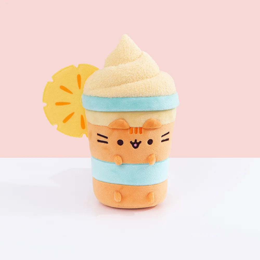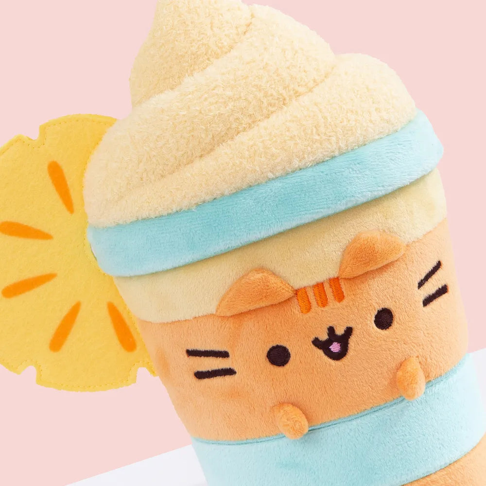 Just when you thought she couldn't get any sweeter, Pusheen is here keeping cool as a refreshing, icy-cold pineapple float! This large, playful plush features Pusheen in homage to that oh-so-popular frozen pineapple treat. Pusheen sits in an orange, yellow, and blue striped cup with embroidered details while a delicious swirl of yellow textured plush rests on top of her head. The soft-serve swirl is accented by a sunny yellow pineapple slice garnish, making this a true treat for collectors of all tastes. All of her facial features and details are embroidered, including Pusheen's adorable smile, whiskers, and tail stripes.