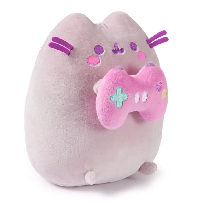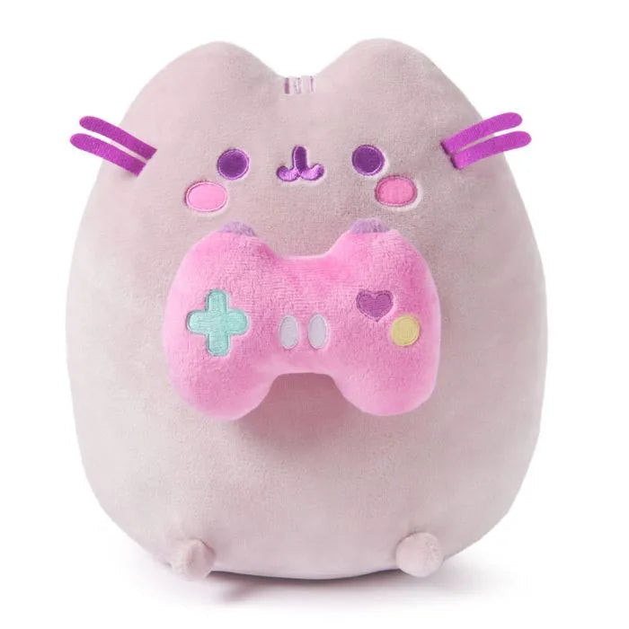 Play your way to victory with Pusheen by your side! This adorable plush features Pusheen in game mode with soft purplish grey plush, purple embroidered details, and a huggable body weighted with pellets that keep her balanced upright. Pusheen also has purple whiskers and rosy, pink cheeks. She holds a bright pink console controller with multi-coloured embroidered buttons, ready to show off her skills as the cutest co-op partner!