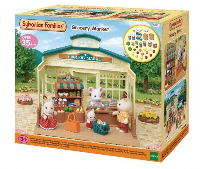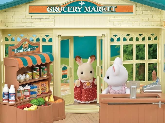 The Grocery Market features a checkout counter and shelving and comes with plenty of ingredients. A shopping basket is also included, allowing for more fun while shopping. The ingredients on top of the counter can be moved into the bag by sliding the bar on the cash register and the walls and flooring of the shop can be detached.